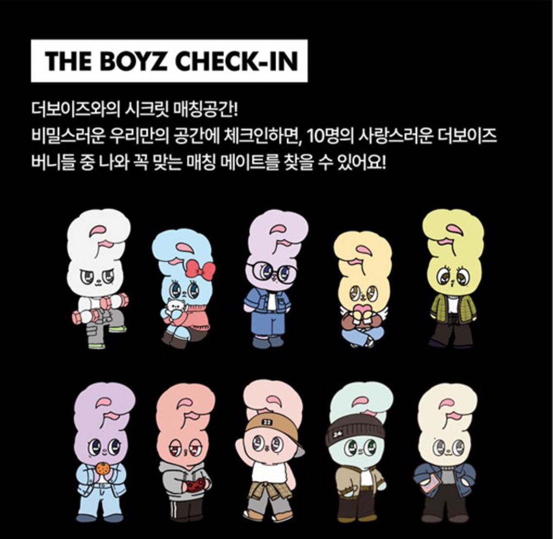 - THE BOYZ CHECK-IN: 더보이즈의 시크릿 매칭공간! 비밀스러운 우리만의 공간에 체크인하며, 10명의 사람스러운 더보이즈 버니들 중 나와 꼭 맞는 매칭 메이트를 찾는 체험