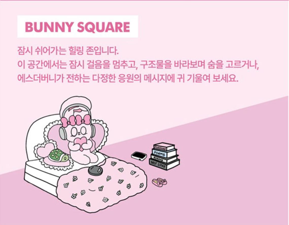 - BUNNY SQUARE: 잠시 쉬어가는 힐링 존으로, 잠시 걸음을 멈추고 구조물을 바라보며 숨을 고르는 공간