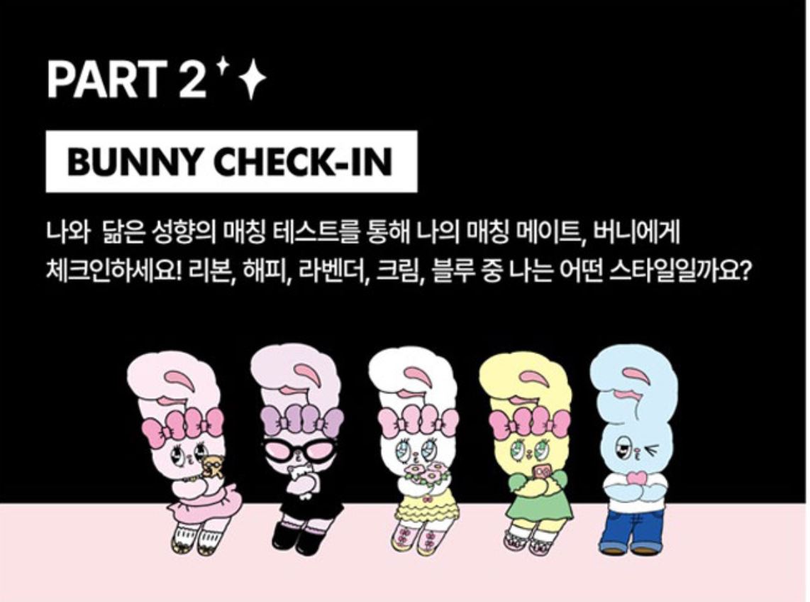 - BUNNY CHECK-IN: 나와 닮은 성향의 매칭 테스트를 통해 나의 매칭 메이트를 찾는 체험 (리본, 해피, 라벤더, 크림, 블루 중 선택)