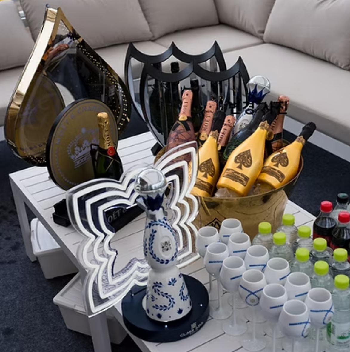 편안하게 쉴 수 있는 테이블과 시트, 샴페인과 핑거푸드가 갖춰진 워터밤의 프리미엄 에리어!