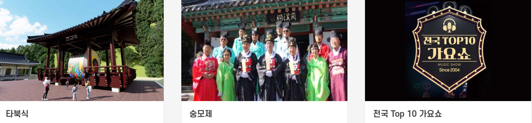 - 전국 Top 10 가요쇼 : 국악엑스포 메인무대 9/14 19:00 / 라인업: 장민호, 김용임, 유지나, 박혜신, 진시몬, 성민, 이미리, 임찬