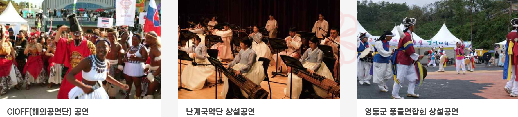 - 난계국악단 상설공연 : 영동군립국안단으로 전통국악, 영화 ost 등 퓨전 국악 등 다양한 분야의 수준 높은 국악공연
