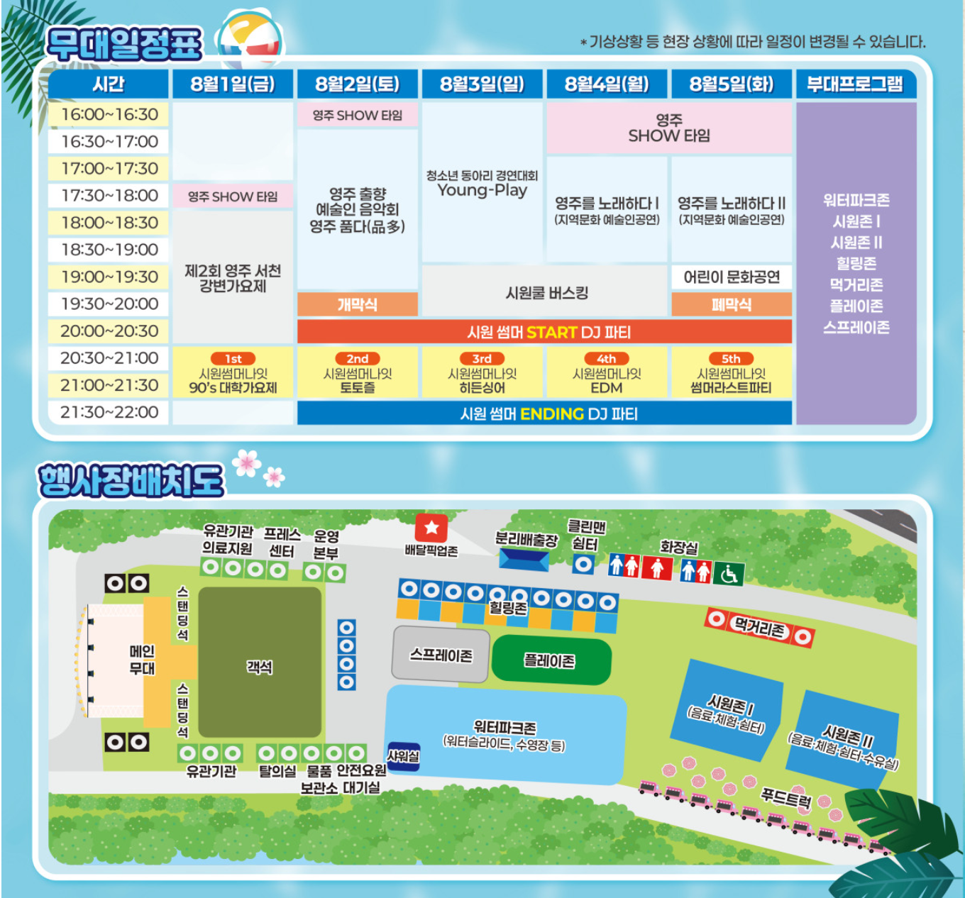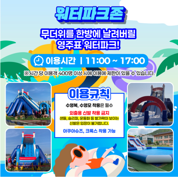 - 워터파크존: 영주표 대형 워터 슬라이드와 풀장 (11:00~17:00)