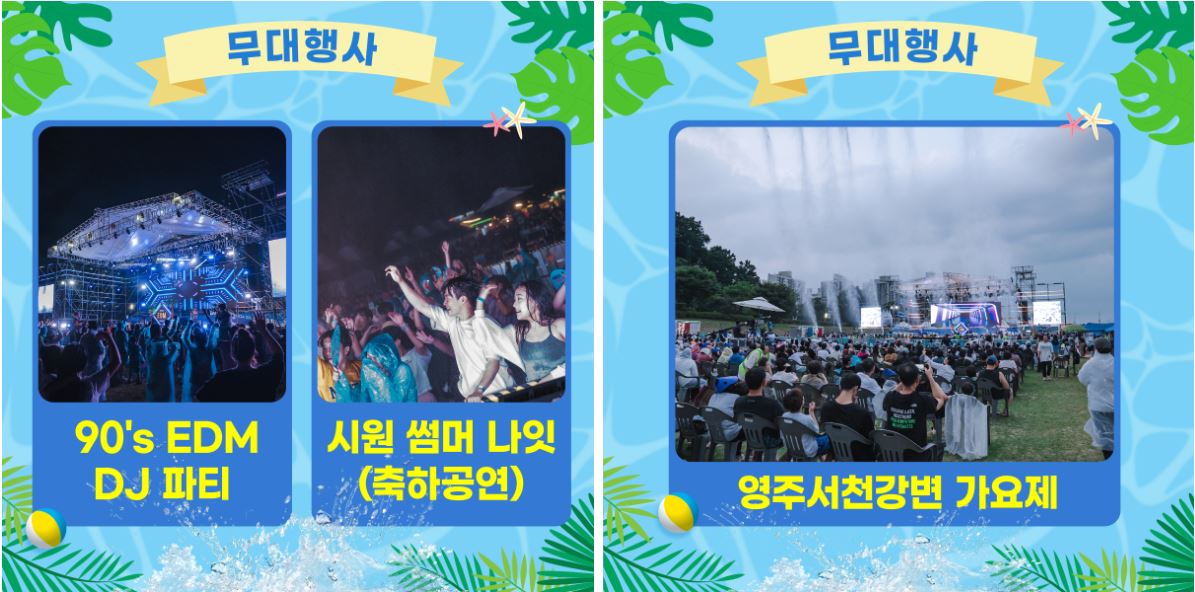 - 90’s EDM DJ 파티 / 시원 썸머 나잇 / 영주 서천강변 가요제 / 출향민 콘서트 / 청소년 경연대회
