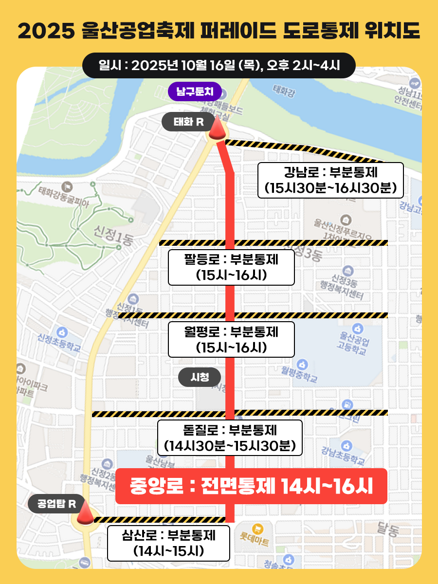 통제 구간 : 중앙로 전면 통제(14:00~16:00) / 팔등로, 강남로, 돌질로 등 일부 구간 부분통제