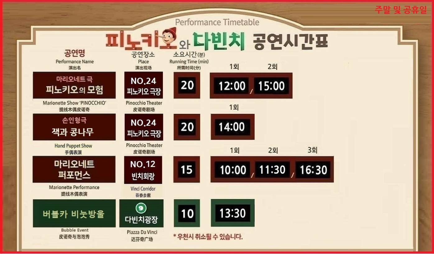 평일, 금요일, 주말 및 공휴일 공연시간이 다르니 홈페이지에서 확인 바랍니다.