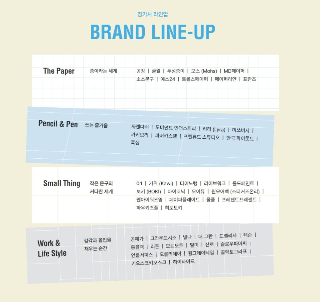 이번 페어에서는 "The Paper", "Pencil & Pen", "Small Thing", "Work & Life Style"의 네 가지 카테고리로 나뉘어 다양한 브랜드의 제품을 선보입니다. 각 카테고리별로 유명 브랜드들이 참여하여 최신 문구 제품을 소개할 예정입니다.