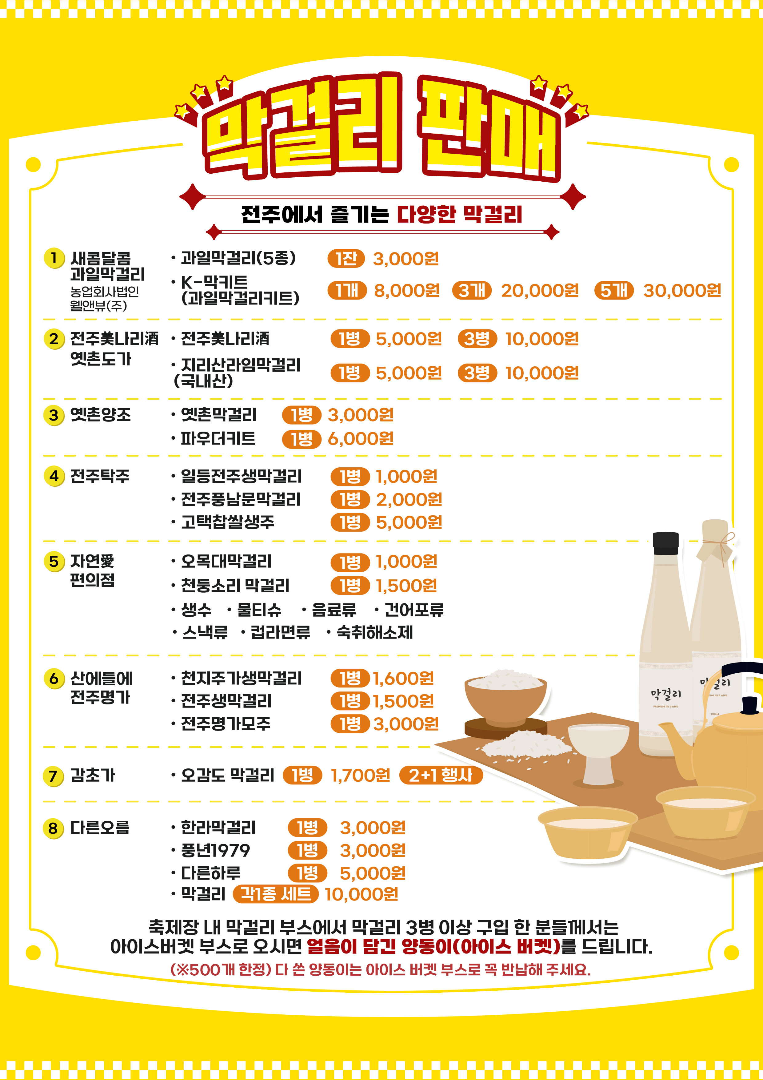 | 🍸 MZ막걸리존 | 막걸리 헌터쇼(16시·19시) / 전주막걸림픽(17시·20시) / 과일막걸리 칵테일쇼(18시·21시) 👉 젊은 세대가 즐기는 막걸리xEDM 파티 🎧 |