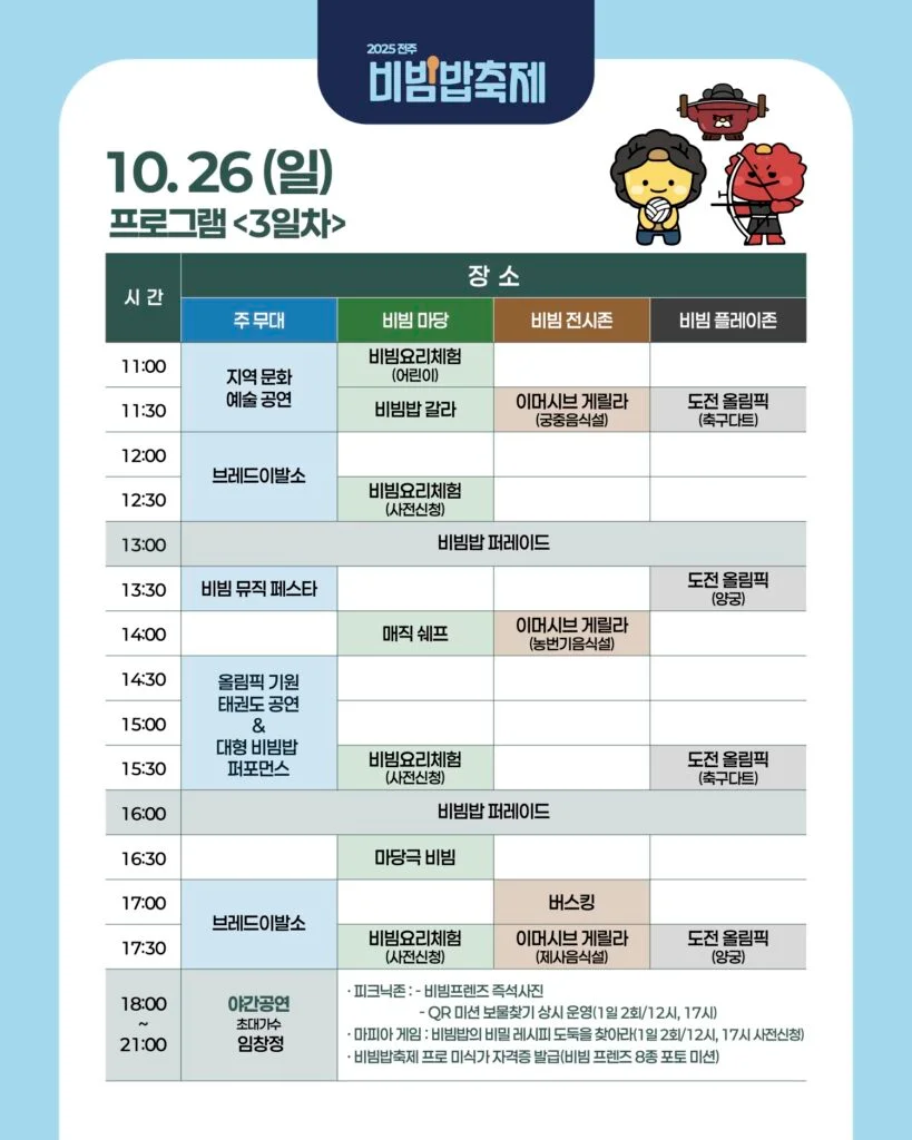 | 대형비빔 퍼포먼스 | 10.26(일) 15:00~16:00 | 전통 의식 + 태권도 공연 + 시민참여형 대형 비빔 이벤트 🍳 |