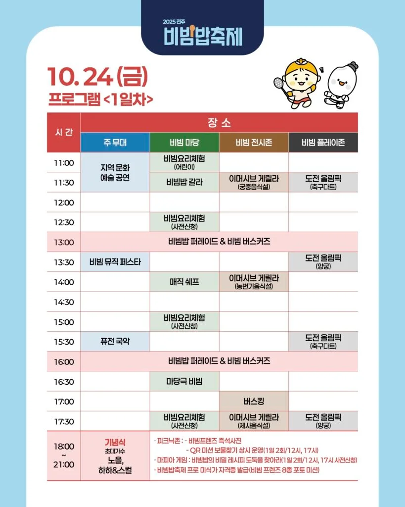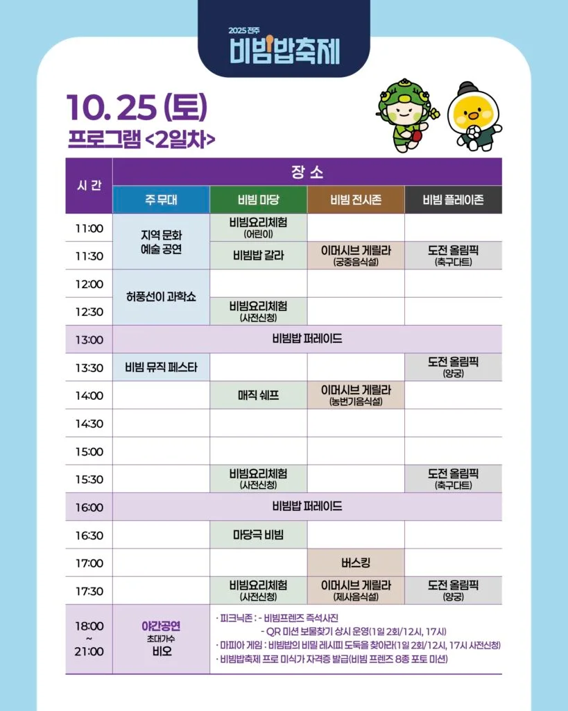 | 비빔 뮤직 페스타 | 13:30 | 흥겨운 음악 밴드 공연으로 분위기 업! 🎶 |