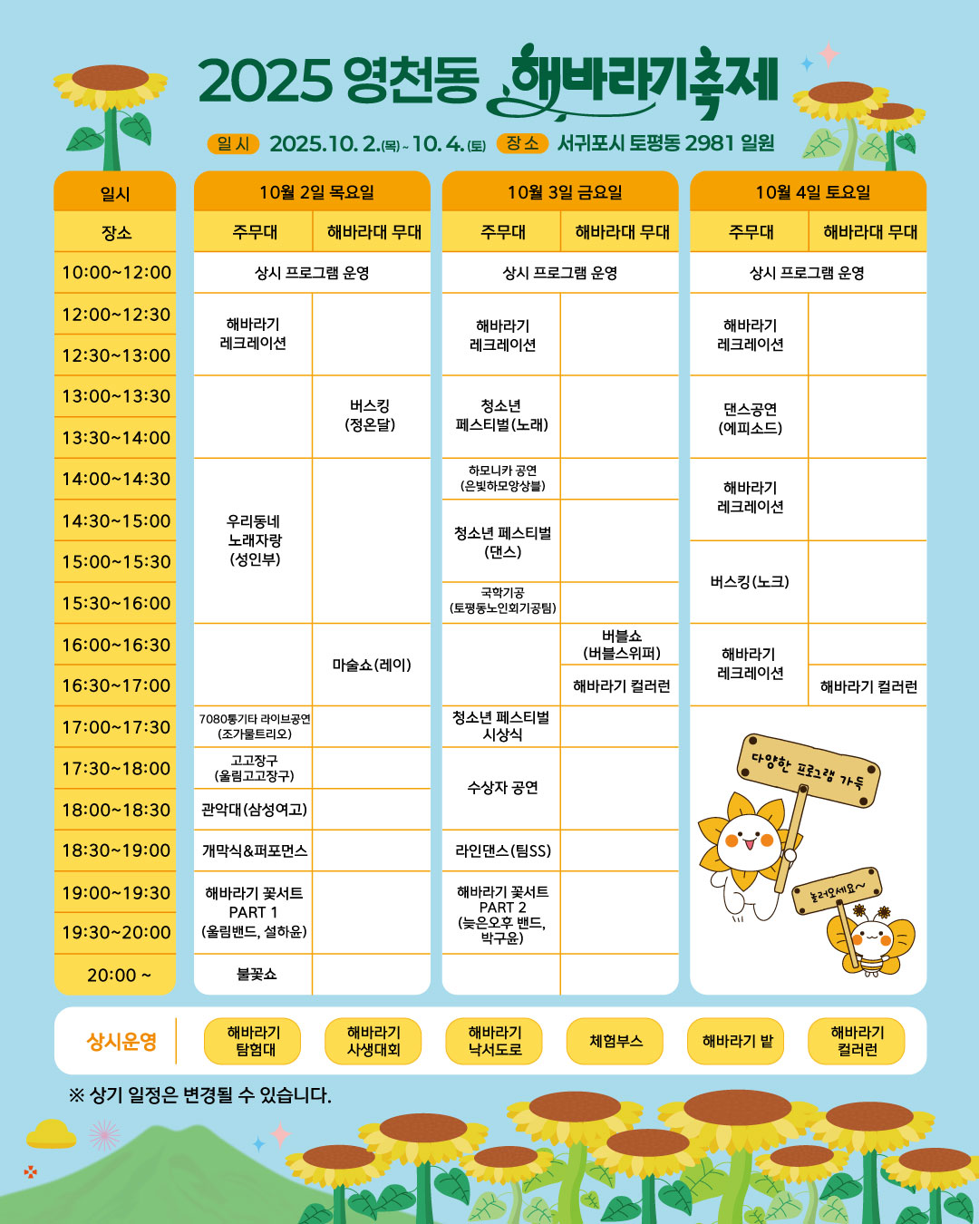 | 10월 3일(금) | 청소년 페스티벌(노래·댄스), 하모니카 공연, 국악 기장 | 해바라기 레크리에이션, 버블쇼, 컬러런 |