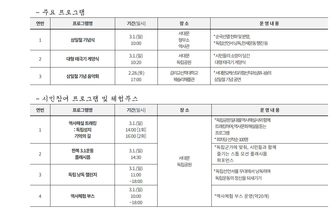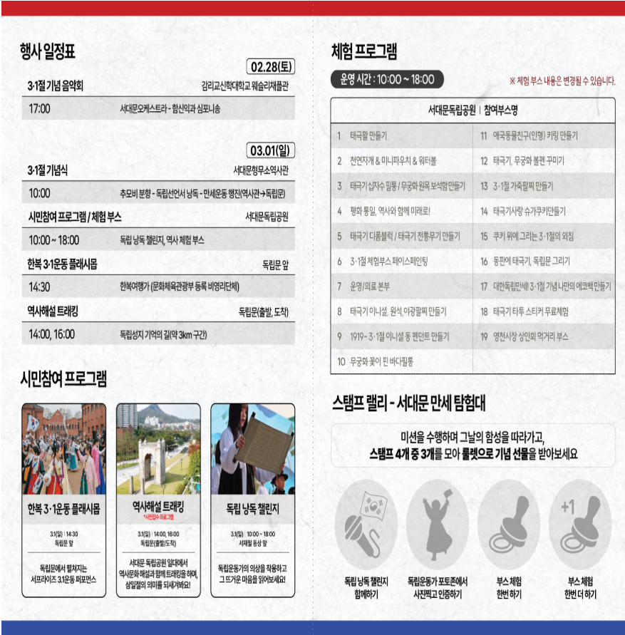 서대문구의 역사적 명소에서 기념식과 만세운동을 펼치며, 다양한 체험 프로그램이 운영됩니다.