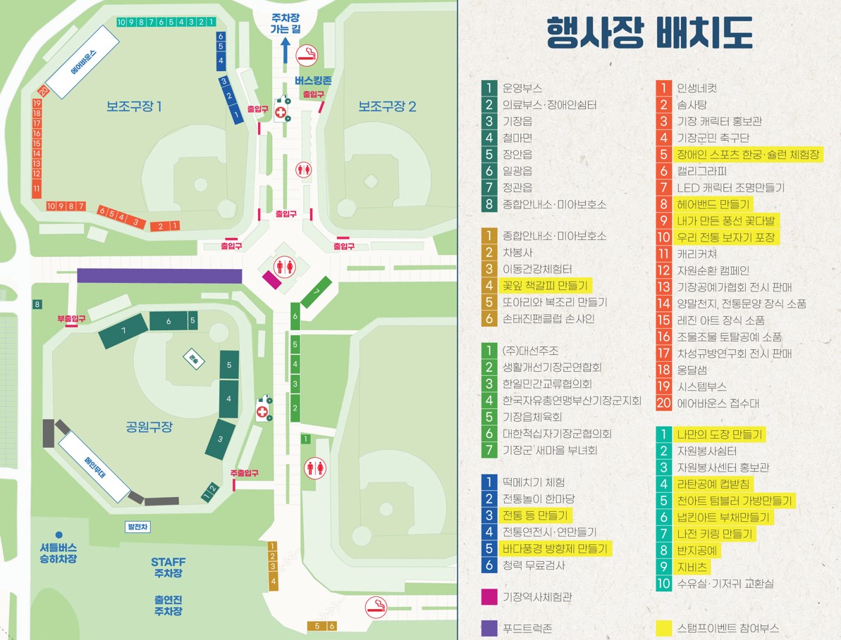 - 체험행사: 기장군민 걷기대회, 화합한마당, 백일장·사생대회, 로봇이 만드는 솜사탕 체험 등