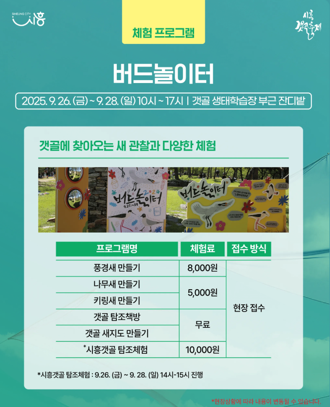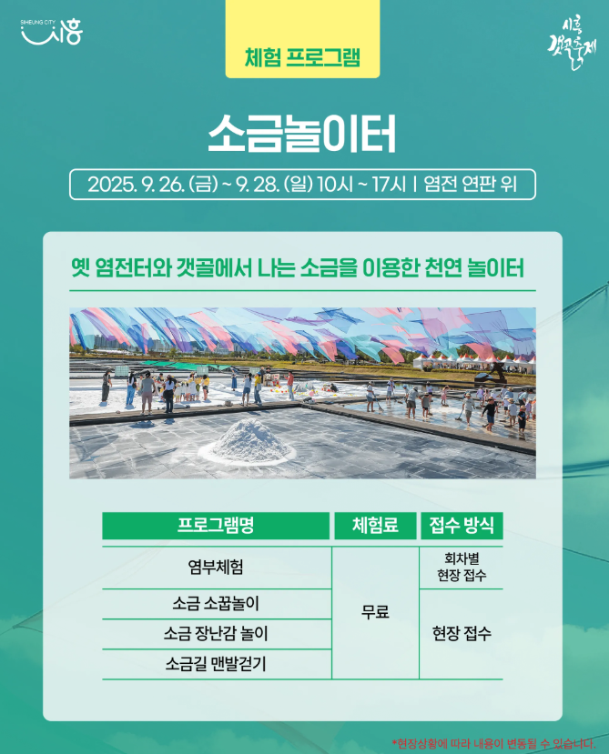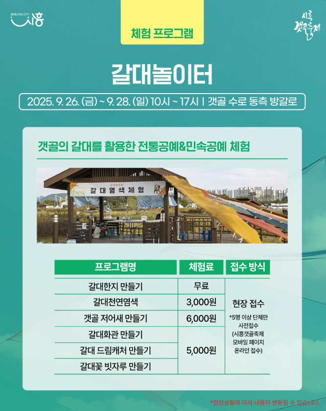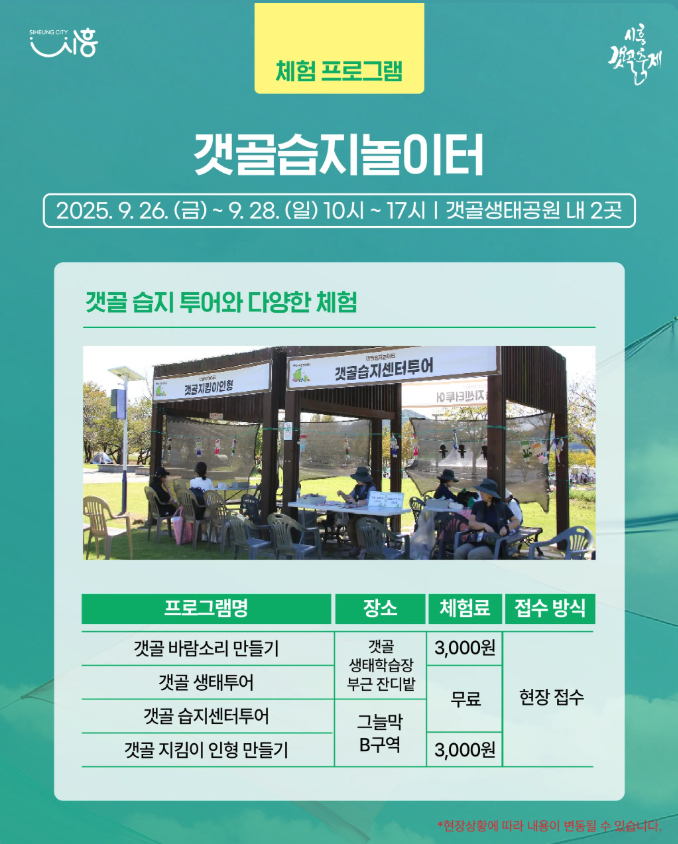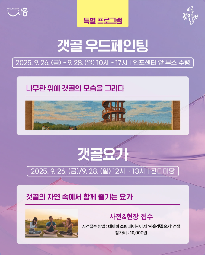 | 2025. 9. 26.(금) ~ 9. 28.(일) | 시흥 갯골생태공원 | 시흥시 | 무료 (일부 체험 유료) |