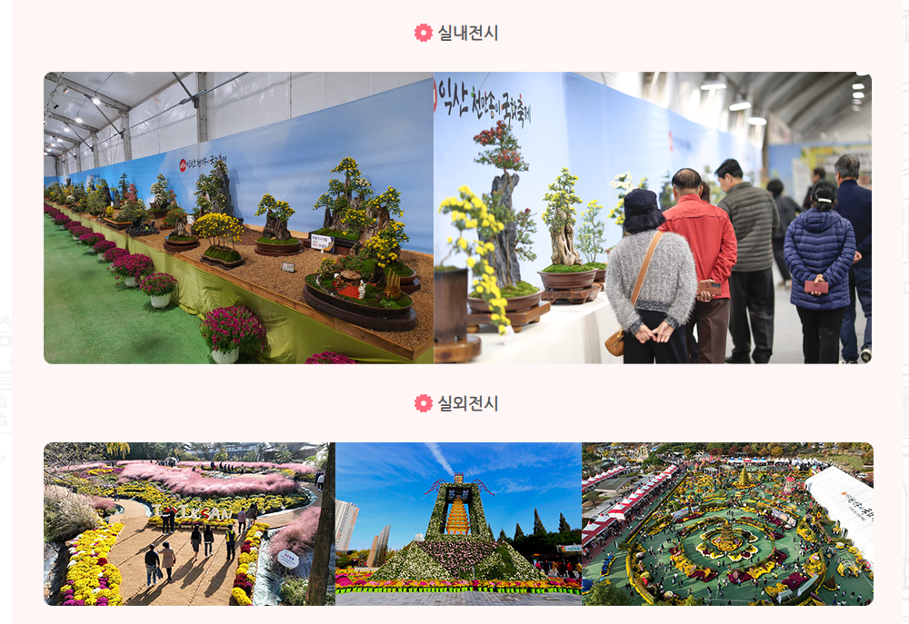 - 실외정원: 1,000만 송이 국화가 장식된 테마별 정원(백제무왕 조형물, 국화터널, 포토존 등)