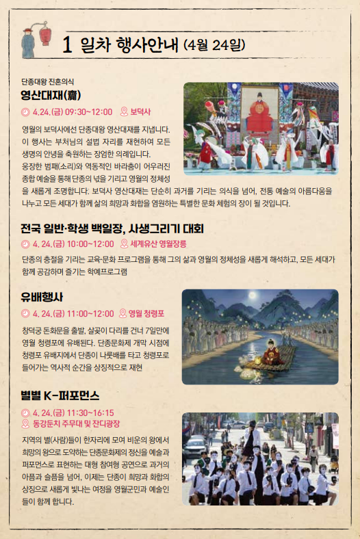 | 야간 행사 | 4/24 불꽃드론쇼, 4/25 단종국장 야간 재현 - 놓치지 마세요! |