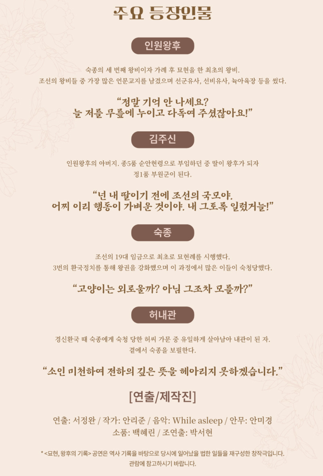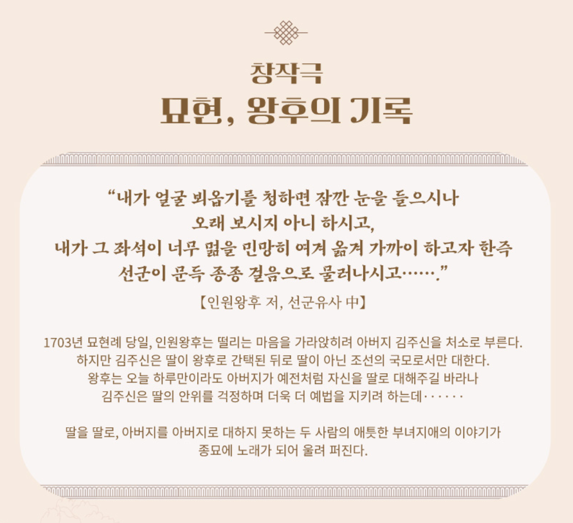 이 뮤지컬은 숙종 29년(1703년) 인원왕후의 묘현례를 주제로 하여, 조선 왕실의 문화를 생생하게 체험할 수 있는 기회를 제공합니다.