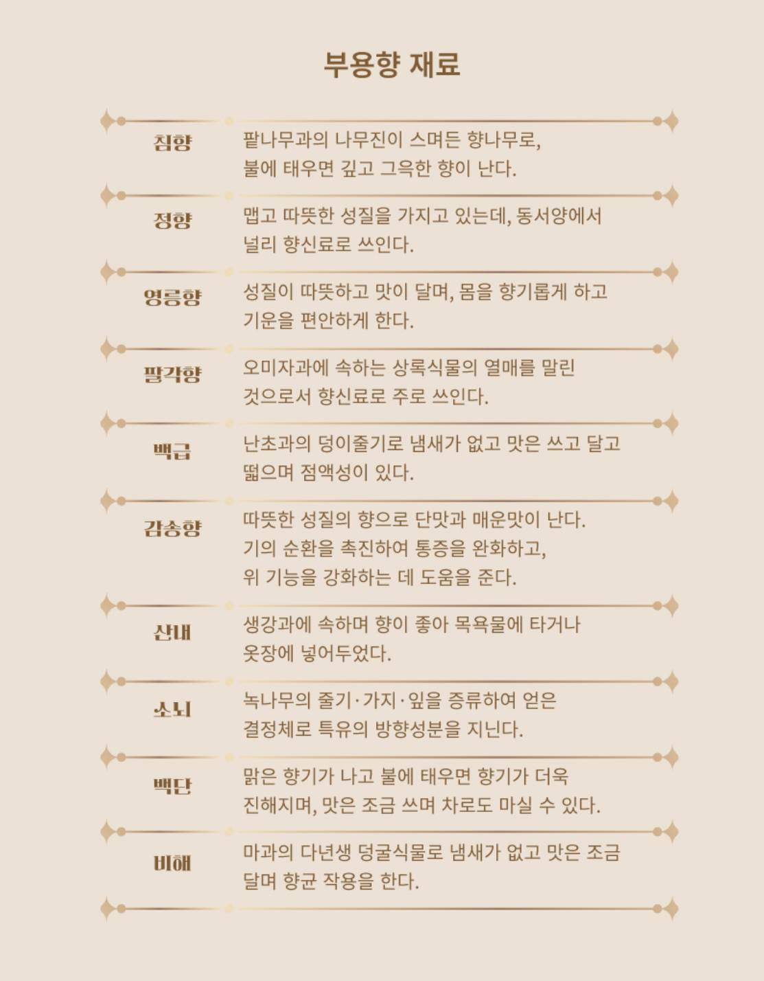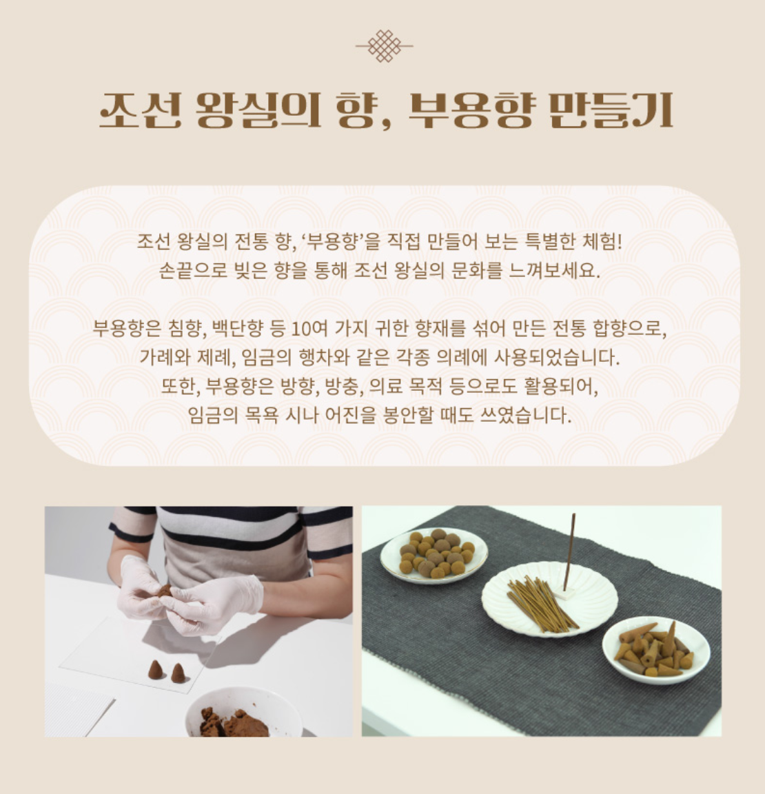 조선 왕실의 전통 향, '부용향'을 직접 만들어 보는 특별한 체험! 손끝으로 빚은 향을 통해 조선 왕실의 문화를 느껴보세요. 부용향은 침향, 백단향 등 10여 가지 귀한 향재를 섞어 만든 전통 합향으로, 가례와 제례, 임금의 행차와 같은 각종 의례에 사용되었습니다. 또한, 부용향은 방향, 방충, 의료 목적 등으로도 활용되어, 임금의 목욕 시나 어진을 봉안할 때도 쓰였습니다.