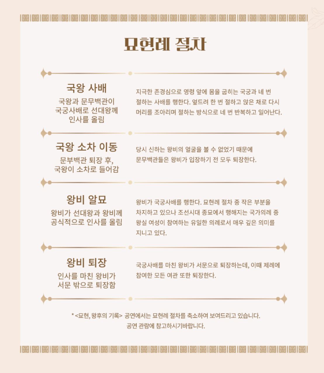 ※ <묘현, 왕후의 기록> 공연은 역사 기록을 바탕으로 당시에 일어났을 법한 일들을 재구성한 창작극입니다. 공연에서는 묘현례 절차를 축소하여 보여드리고 있습니다. 관람에 참고하시기 바랍니다.