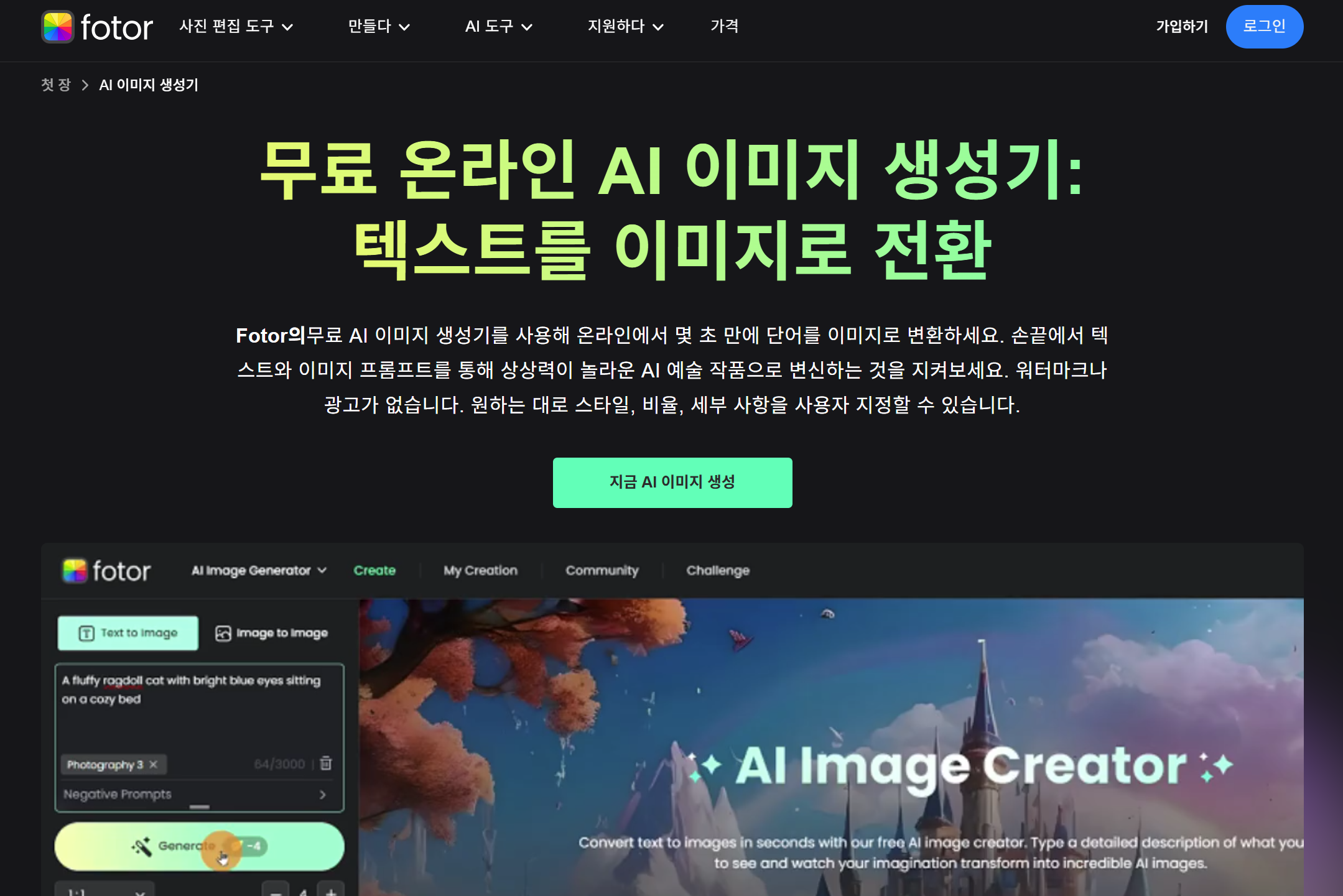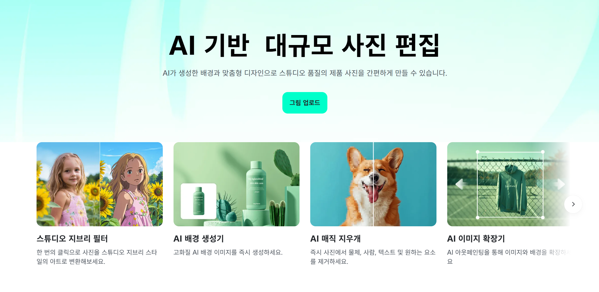 fotor는 이미지 편집 기능과 AI 이미지 생성 기능이 결합된 플랫폼입니다. 다양한 애니메이션 필터를 제공하고 원클릭으로 간편하게 이미지가 완성됩니다. 스튜디오 지브리와 유사한 스타일의 다양한 필터를 적용하여, 이미지를 더욱 돋보이게 만들어줍니다. 사용자가 원하는 요소를 추가하거나 제거하는 것이 가능해, 인스타, 블로그용 편집까지 한번에 가능합니다.