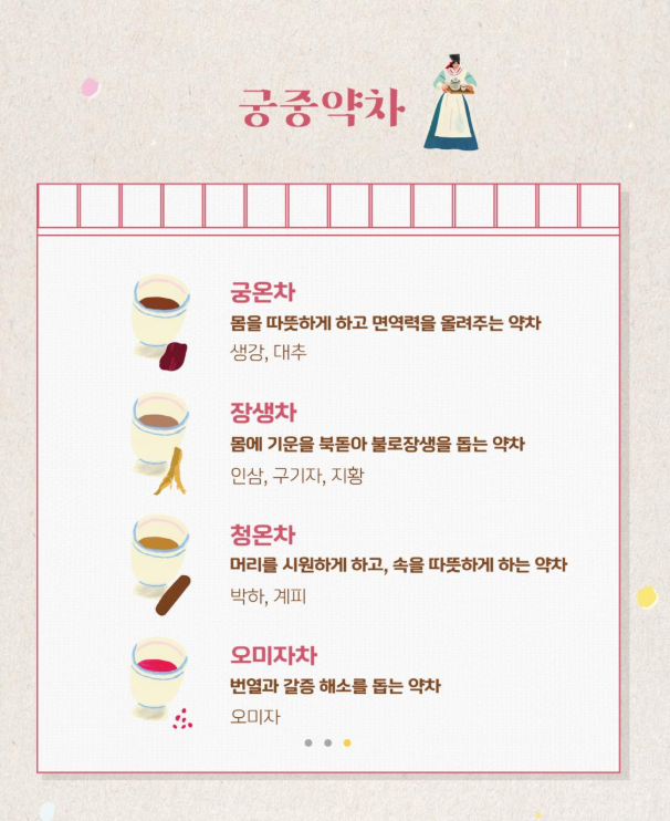 - 궁온차 : 몸을 따뜻하게 하고 면역력을 올려줍니다. 재료 생강, 대추