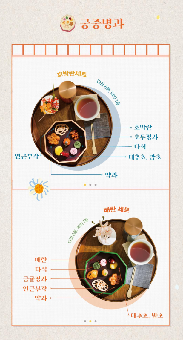 - 호박란 세트 : 다과6종, 약차 1종 / 호박란, 호두정과, 다식, 대추초, 밤초, 약과, 연근부각