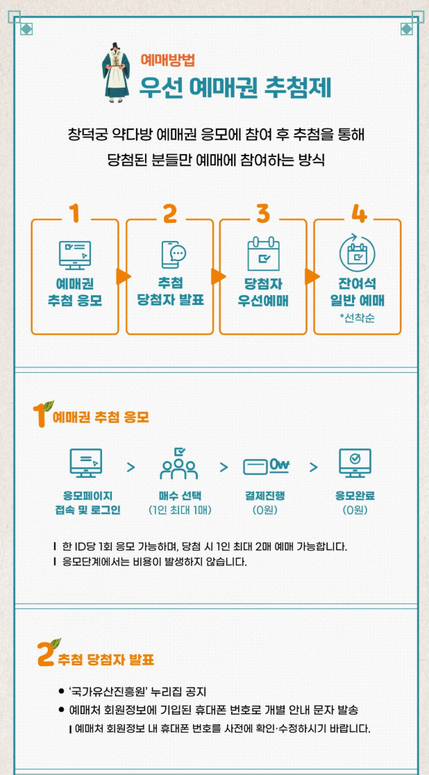 2025년 상반기 창덕궁 약다방 티켓은 ‘예매권 추첨’에 응모한 뒤, 당첨자에 한 해 구매가 가능합니다.