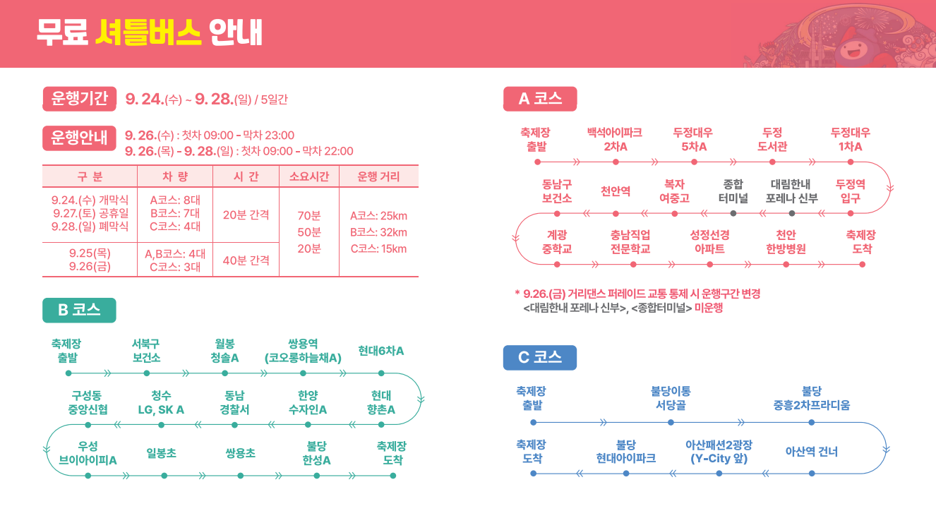 행사 기간 동안 천안 전역에서 무료 셔틀버스가 운영됩니다.