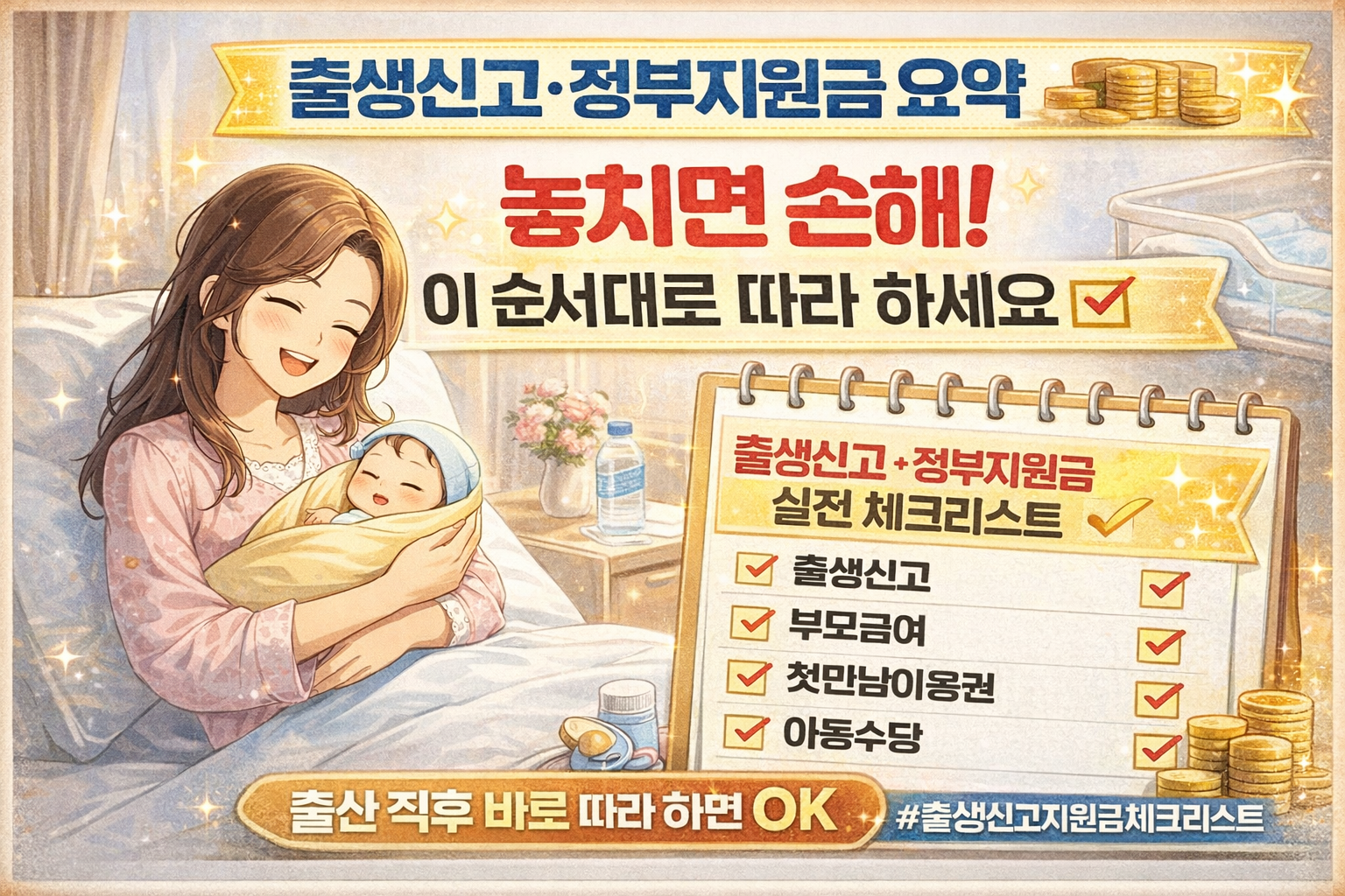 출생신고 → 부모급여 → 첫만남이용권 → 아동수당 → 보육/의료 순으로 체크하면 실수 없음