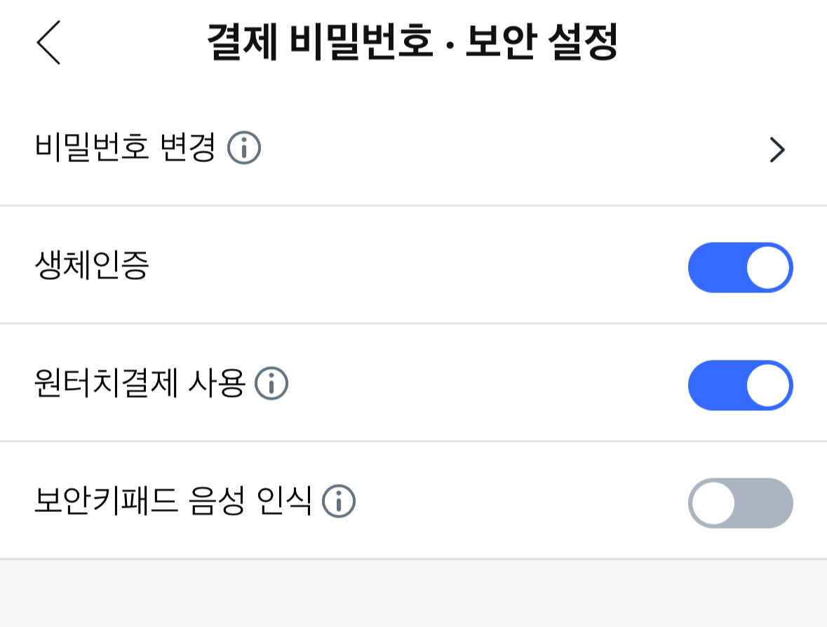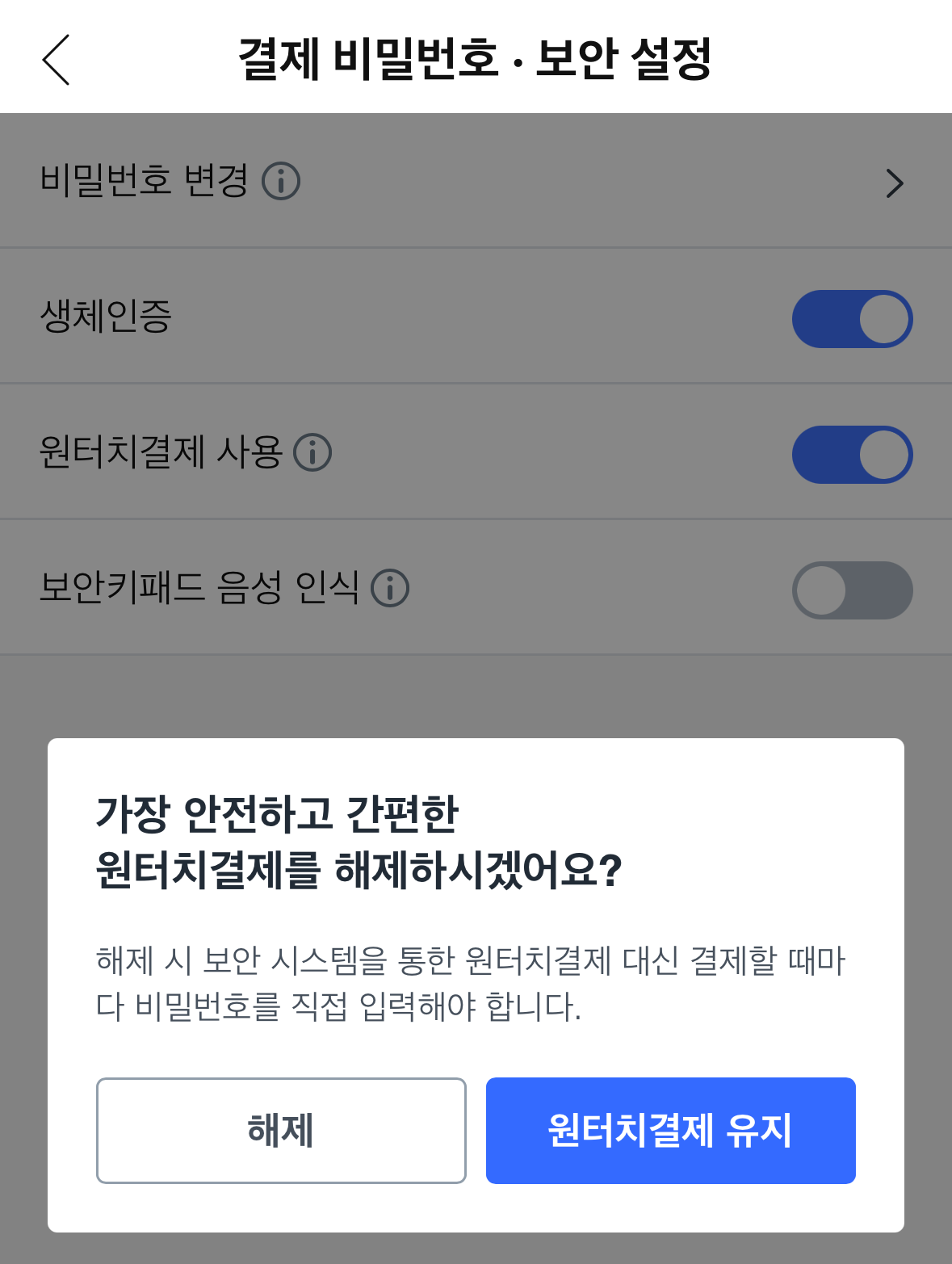 | 2 | 원터치 결제 OFF | ⭐⭐⭐⭐⭐ |