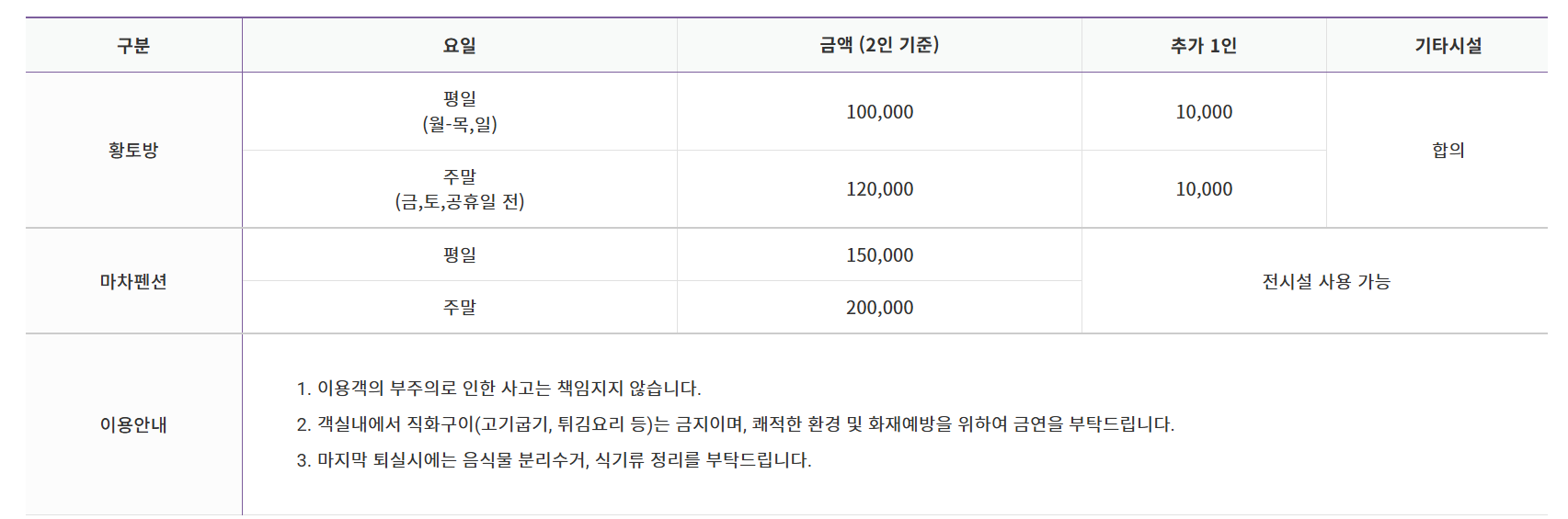 - 황토방은 2명이 적정인원, 4명까지 취사가능