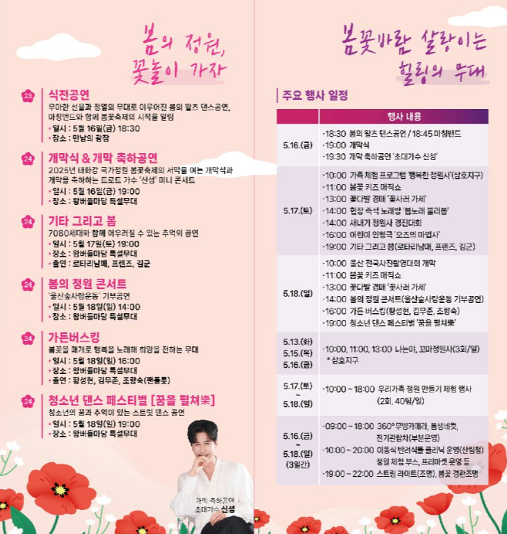 - 봄꽃축제 식전공연 : 5월 16일(금) 18:30 만남의 광장~왕버들마당 특설무대
