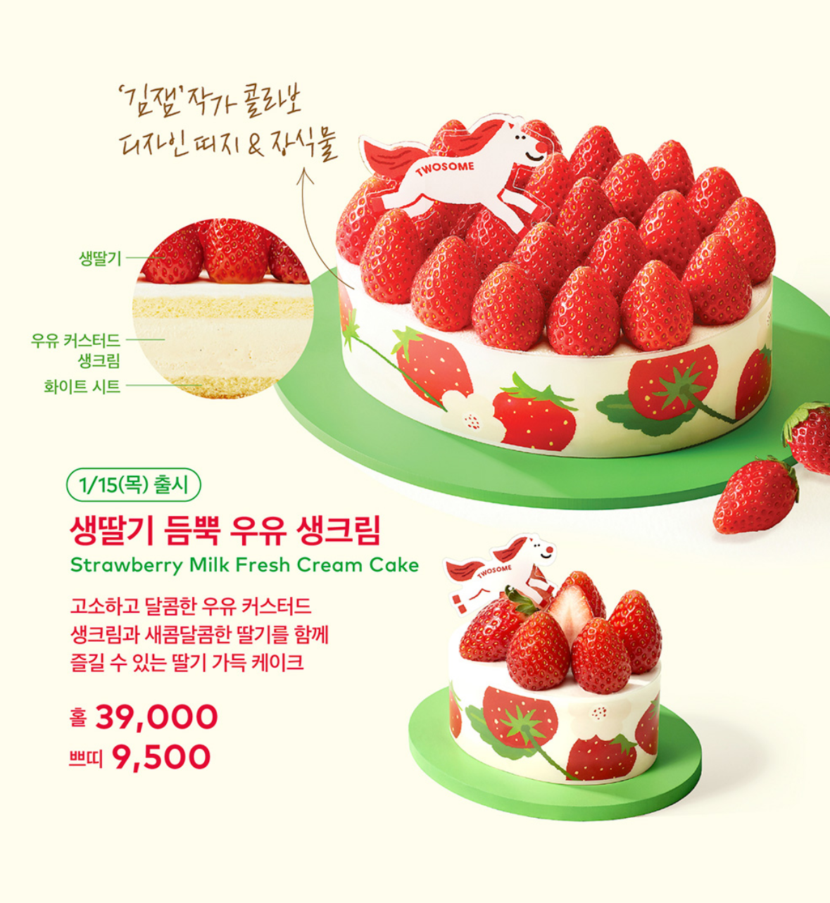 | 생딸기 듬뿍 우유 생크림 케이크 | 1/15 | 홀 39,000원 / 피스 9,500원 |