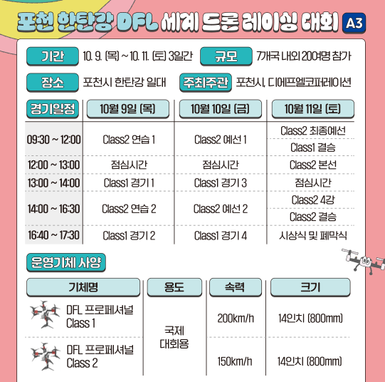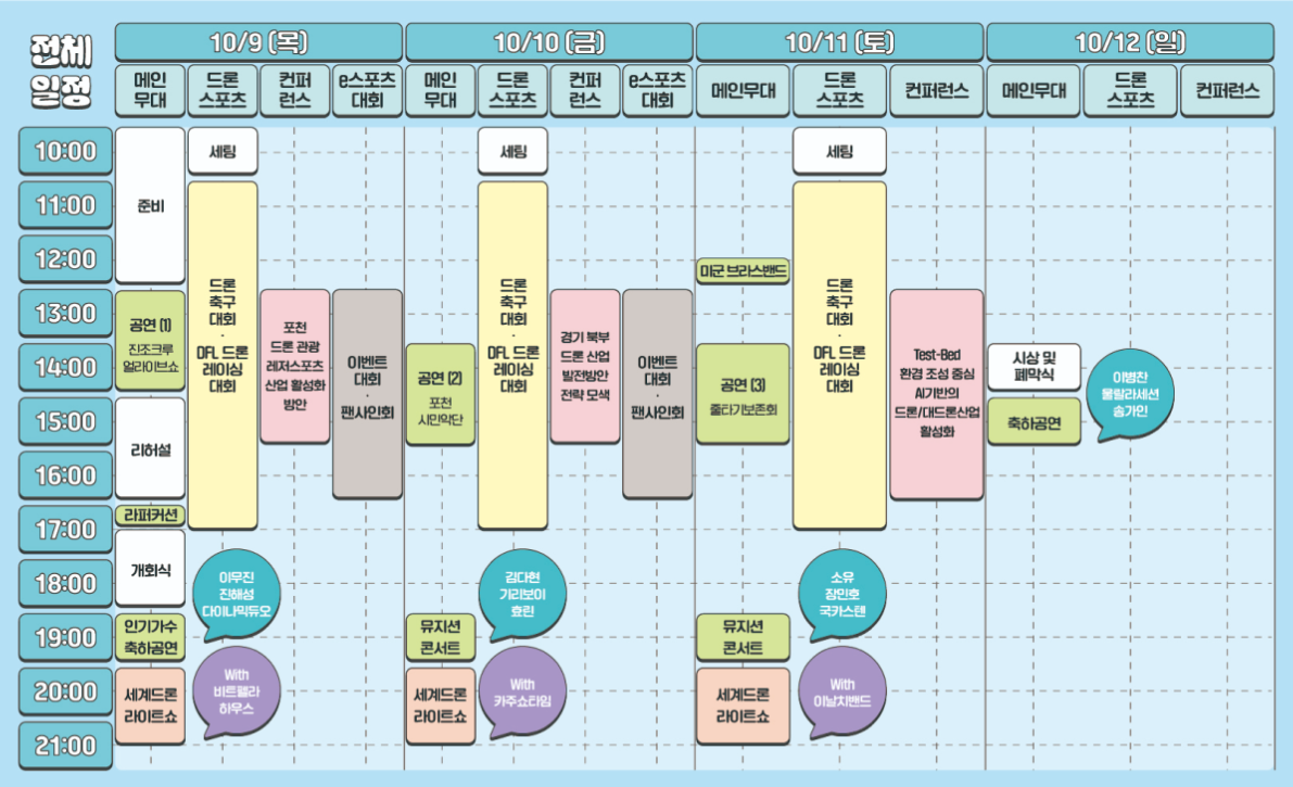 총 6,000대의 드론이 밤하늘을 수놓는 국내 최대 규모의 드론 퍼포먼스를 비롯해, 드론 레이싱, 드론 축구, 체험 프로그램, 그리고 인기 가수들의 공연까지 즐길 수 있는 글로벌 축제입니다.