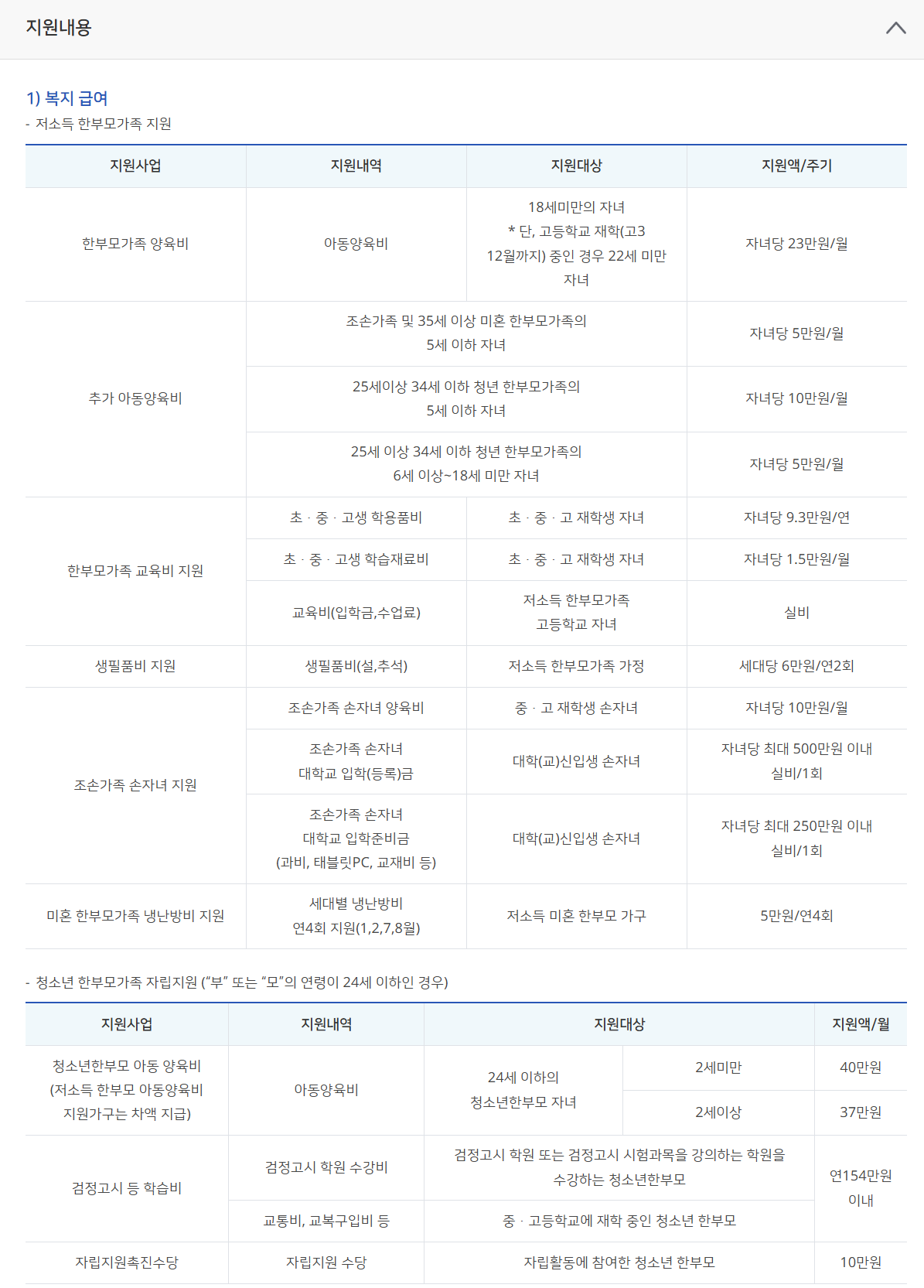 한부모가정 지원금의 혜택은 다음과 같습니다: