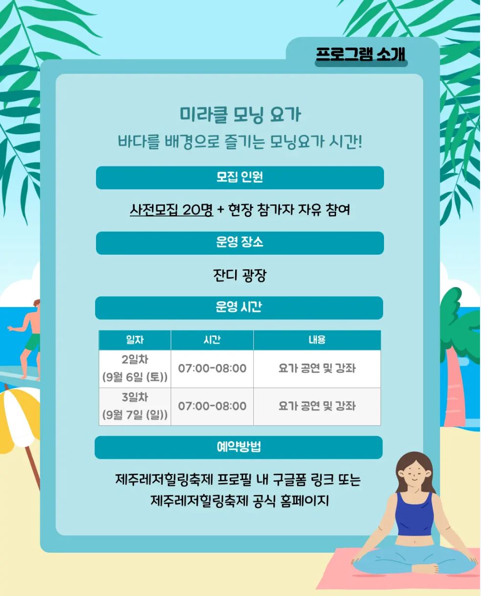 - 예약 방법: 제주레저힐링축제 프로필 내 구글폼 링크 또는 공식 홈페이지