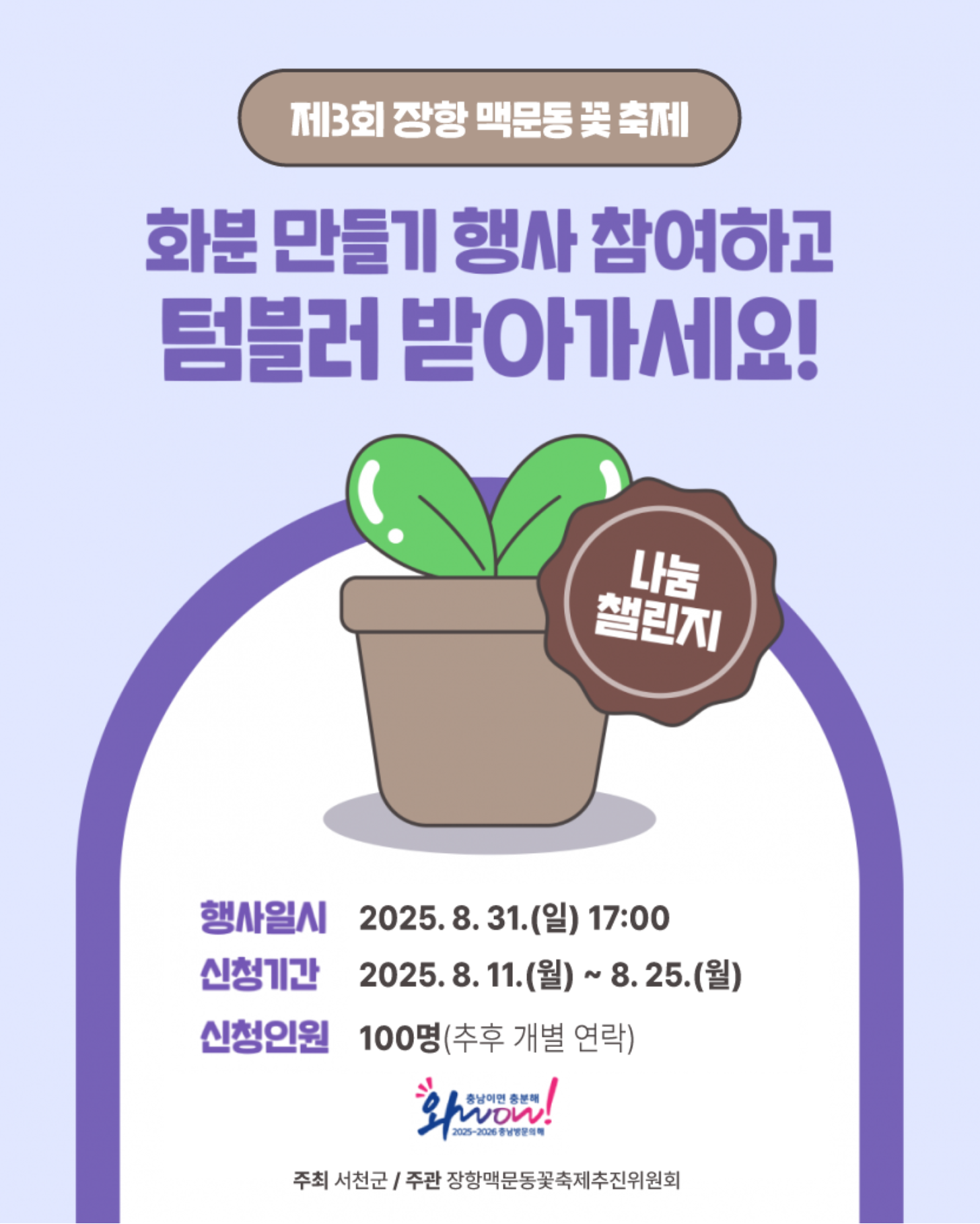 맥문동이라는 지역자원을 활용한 서천의 생태문화 이미지를 강화하는 ⭐맥문동 화분 만들기⭐ 행사입니다.