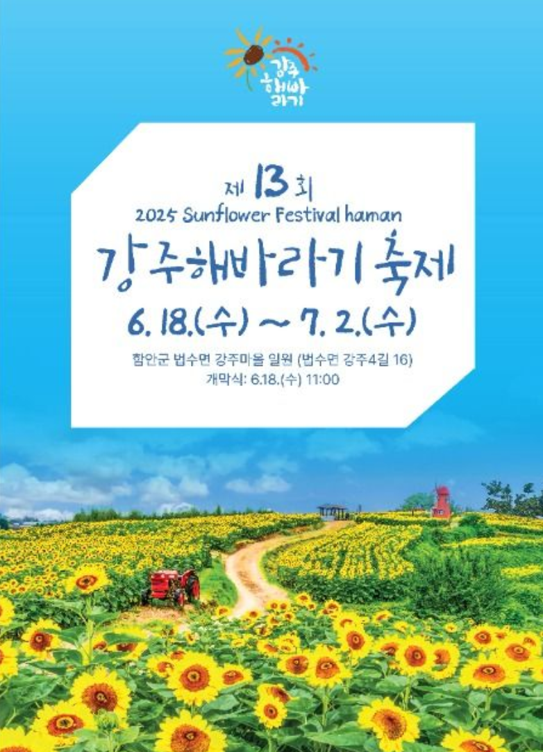경남 함안군 법수면 강주마을에서 펼쳐지는 이 축제는 마을 주민들이 함께 가꾼 해바라기밭과 지역 문화를 접할 수 있는 대표 여름 꽃축제입니다.