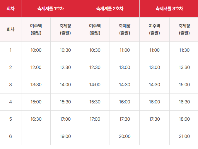 | 축제셔틀 1~3호차 | 여주역 ↔ 축제장 | 10:00 | 21:00 | 30분 간격 |