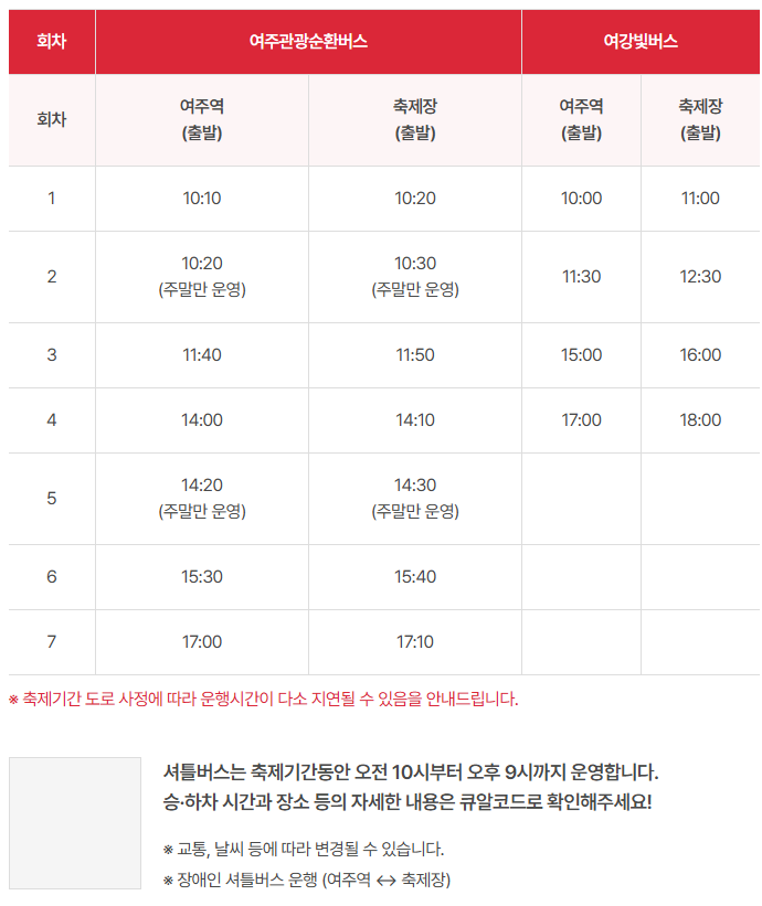 | 여강빛버스 | 여주역 ↔ 축제장 | 10:00~18:00 | - | 주말 전용 노선 |
