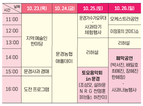 대한민국 사과의 고장 문경에서 열리는 축제로, 사과따기 체험·야외공연·전시·이벤트 등 온 가족이 함께 즐길 수 있는 풍성한 프로그램이 준비되어 있어요.