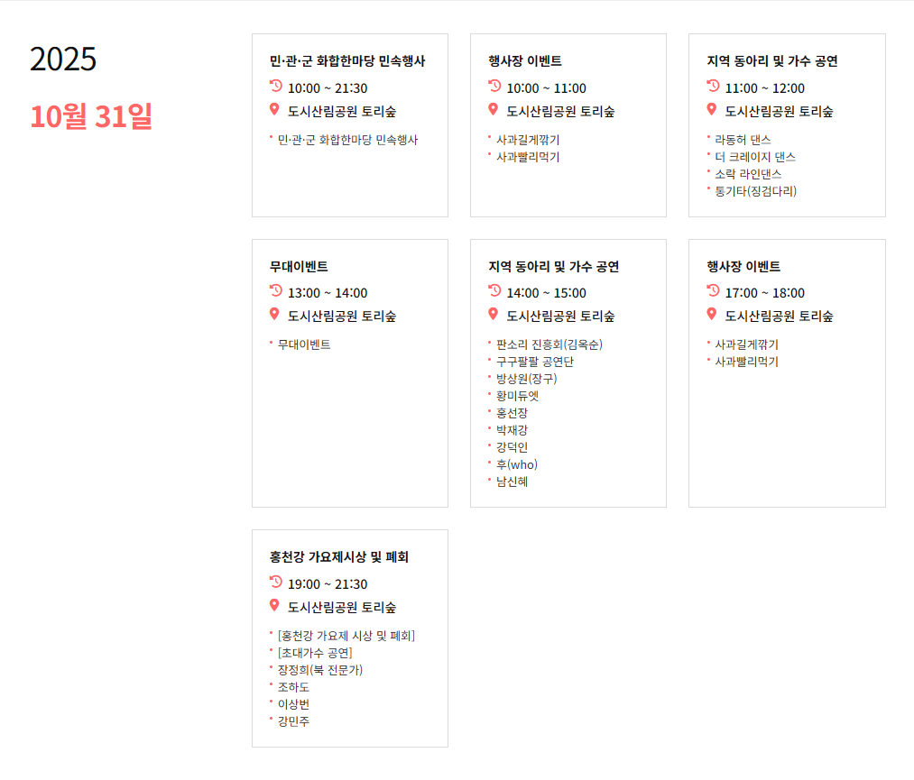 | 10.31(금) | 민관군 화합한마당, 홍천강 가요제 시상식 |