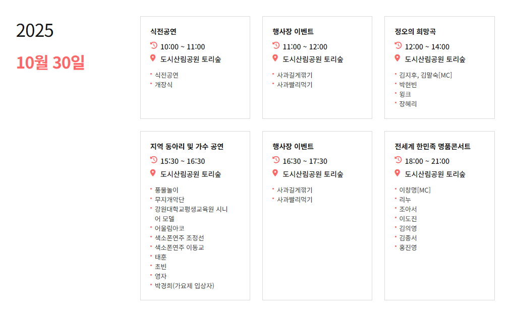 | 10.30(목) | 개막식, 정의의 희망곡 공연, 명품콘서트 (홍진영, 김용임 출연) |