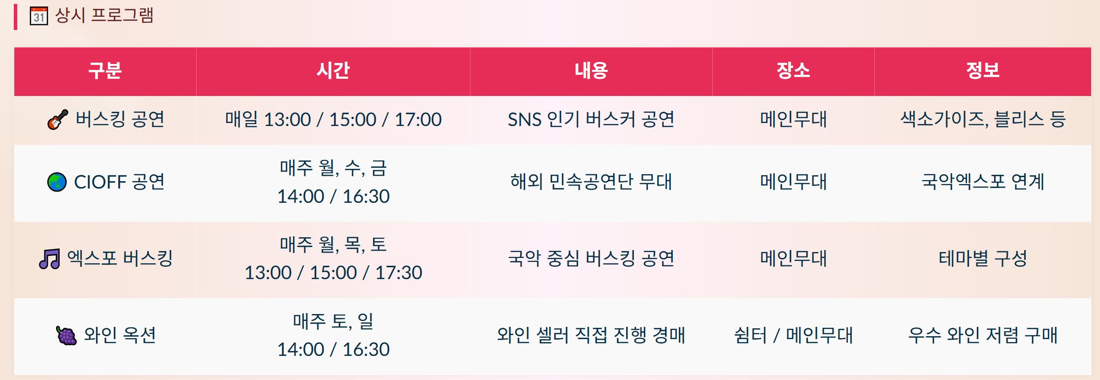 👉 이외에도 매일 버스킹 공연, CIOFF 해외 민속공연, 와인 옥션 등 다채로운 상시 프로그램 진행!