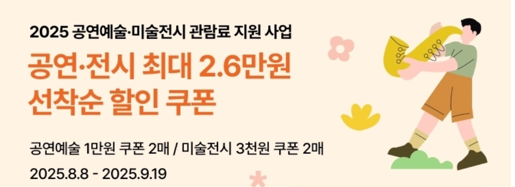 해당 전시는 2025년 미술 전시 관람료 지원 대상으로, 사용 가능한 할인 쿠폰 안내드립니다.