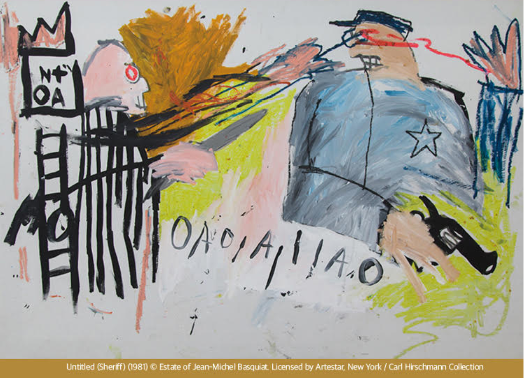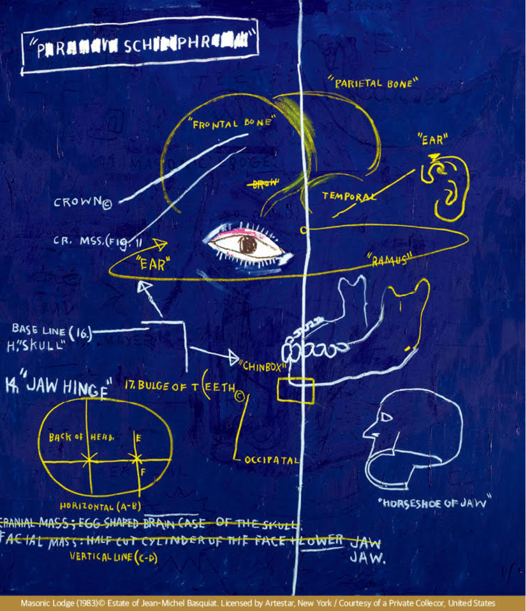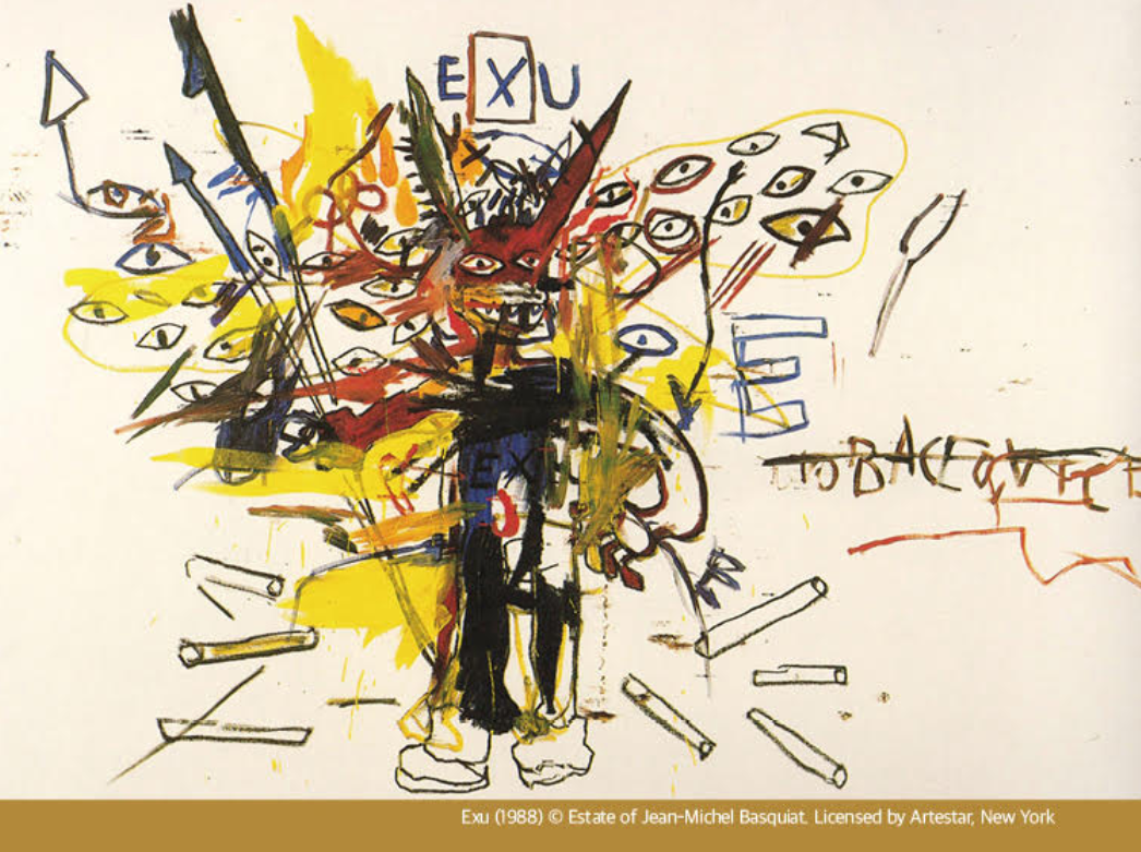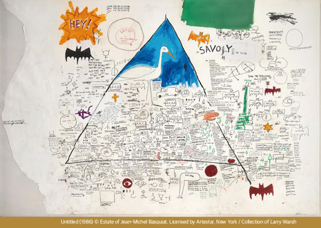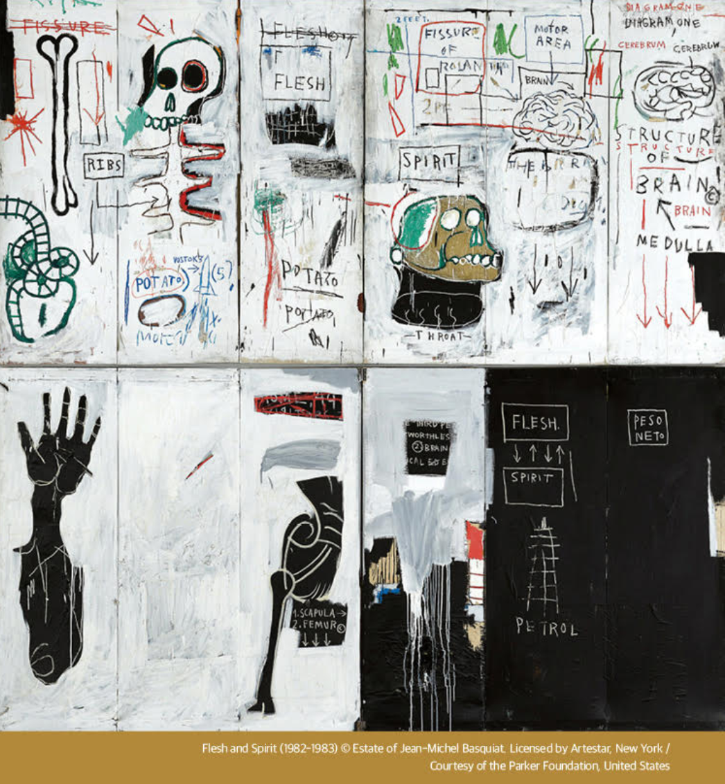 바스키아의 작품은 기호, 역사, 인종, 정체성, 언어를 복합적으로 구성해 다층적인 예술 세계를 보여줍니다.