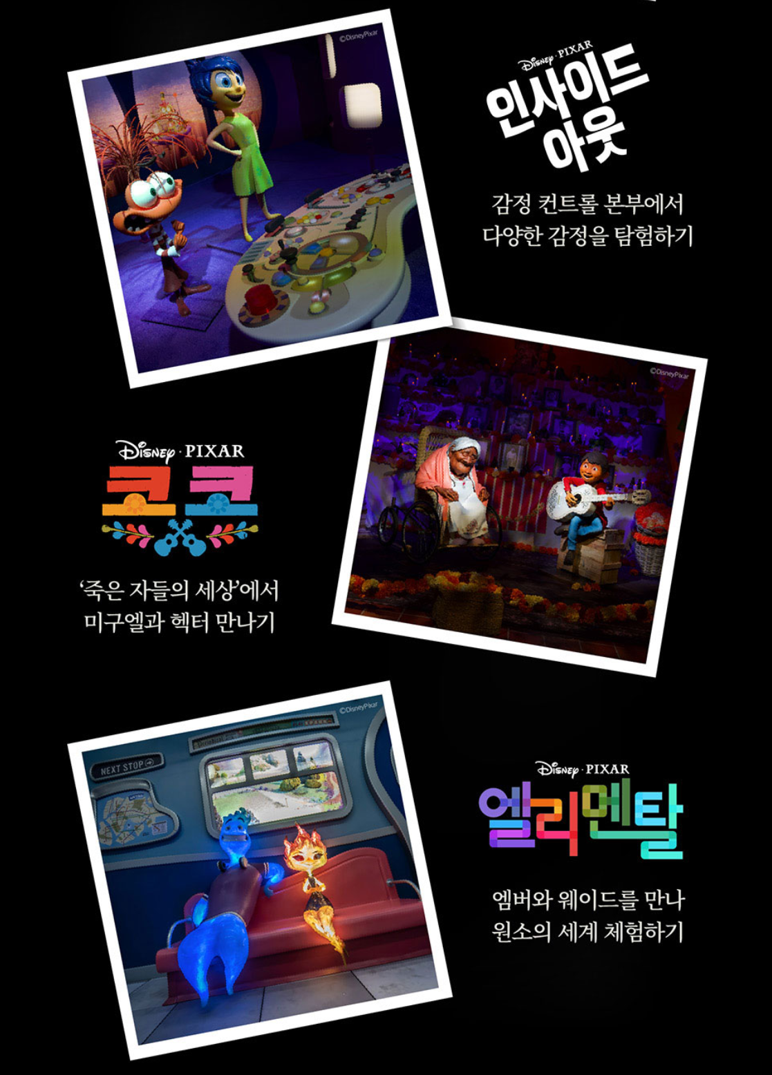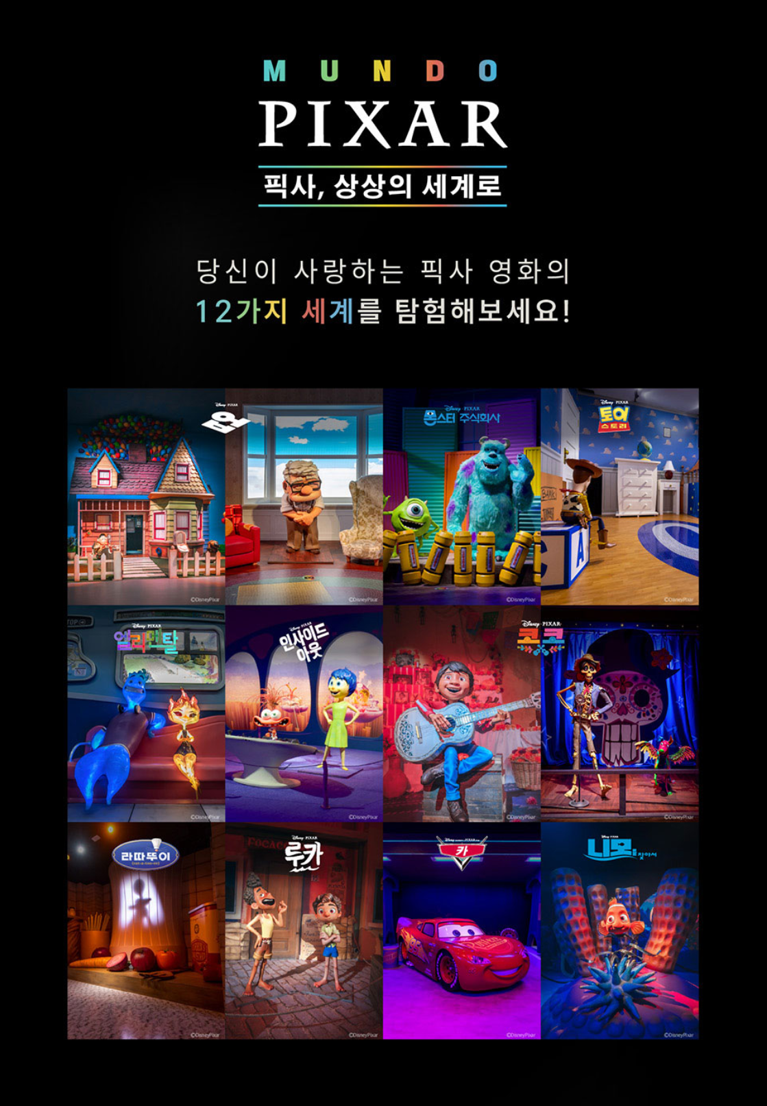 픽사의 잊을 수 없는 이야기들과 함께, 카, 코코, 토이 스토리, 몬스터 주식회사, 업, 니모의 사랑스러운 캐릭터들을 직접 만나는 몰입감 넘치는 세계로 초대합니다.
