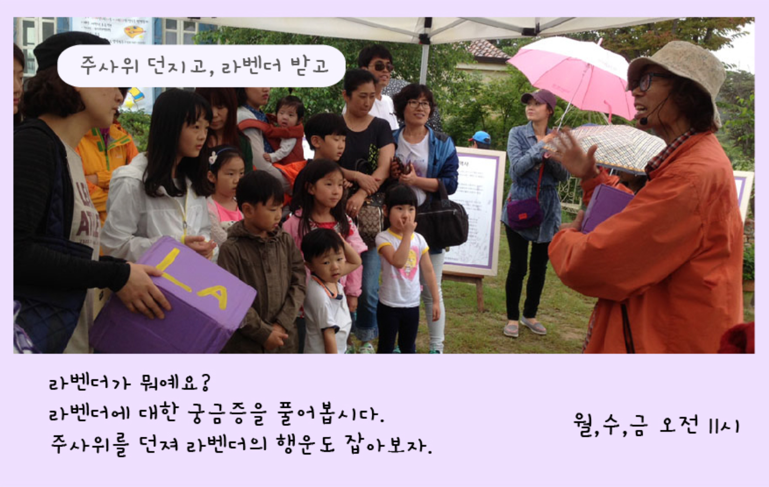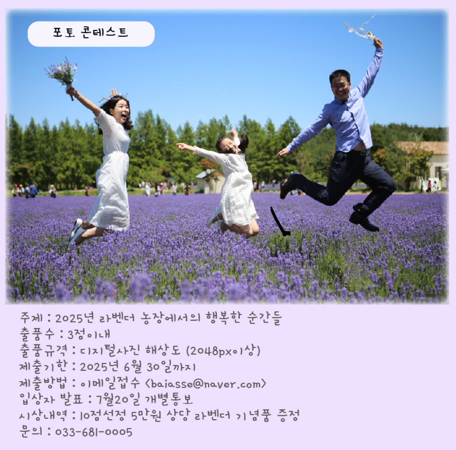 - 복장 팁: 보랏빛, 흰색 계열의 옷은 라벤더 배경과 가장 잘 어울림