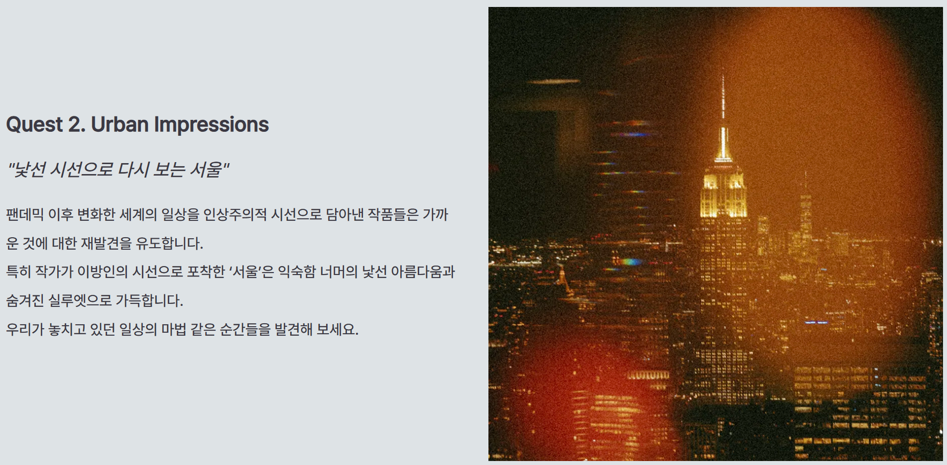 특히 작가가 이방인의 시선으로 포착한 '서울'은 익숙함 너머의 낯선 아름다움과 숨겨진 실루엣으로 가득합니다.