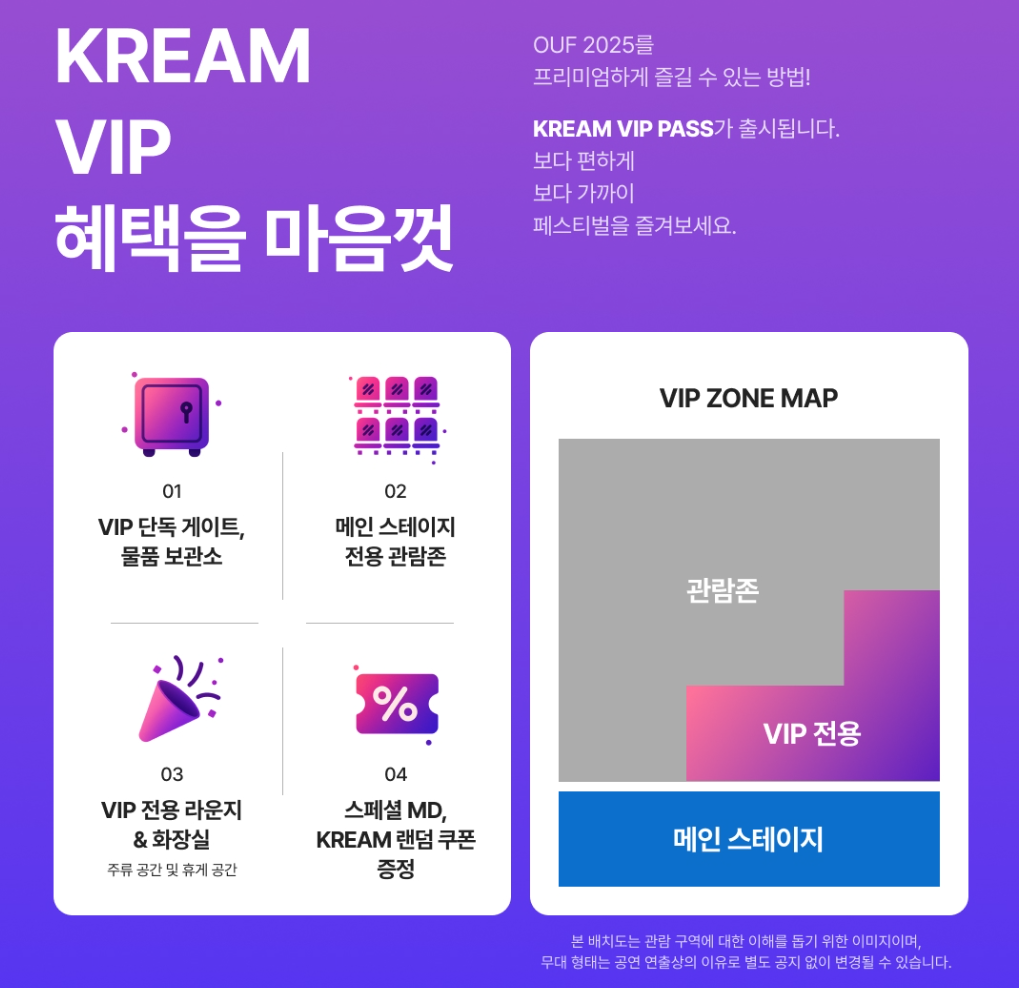 ※ KREAM VIP PASS는 별도의 프리미엄 혜택이 포함된 고급 좌석으로, 일반석과는 차별화된 관람 경험을 제공합니다.